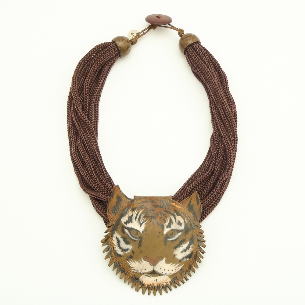 Náhrdelník s koženým přívěškem na kterém je kresba tygra.