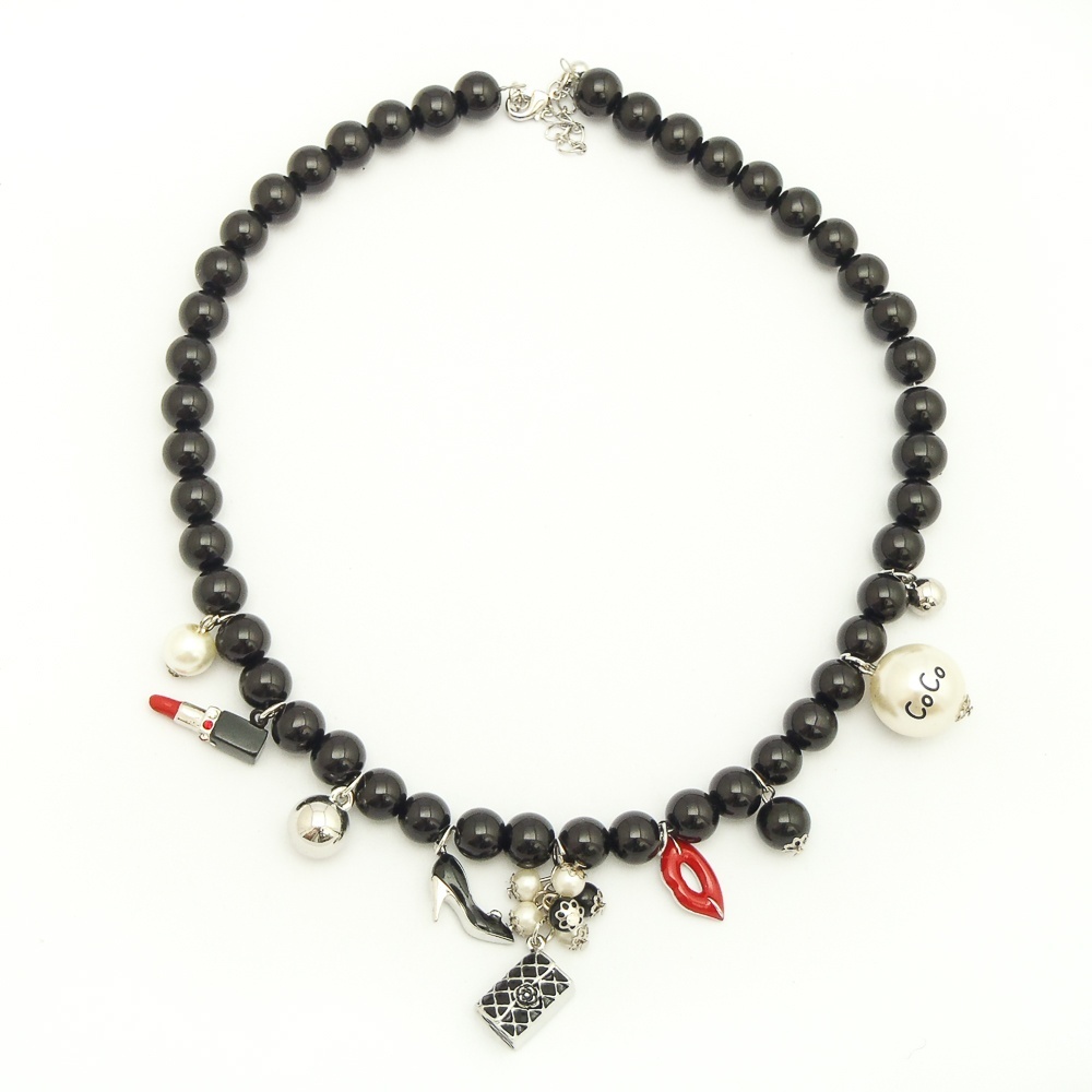 Náhrdelník ze skleněných korálků a přívěšků z bižuterního kovu.