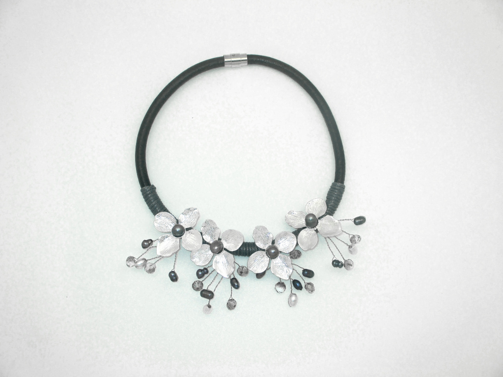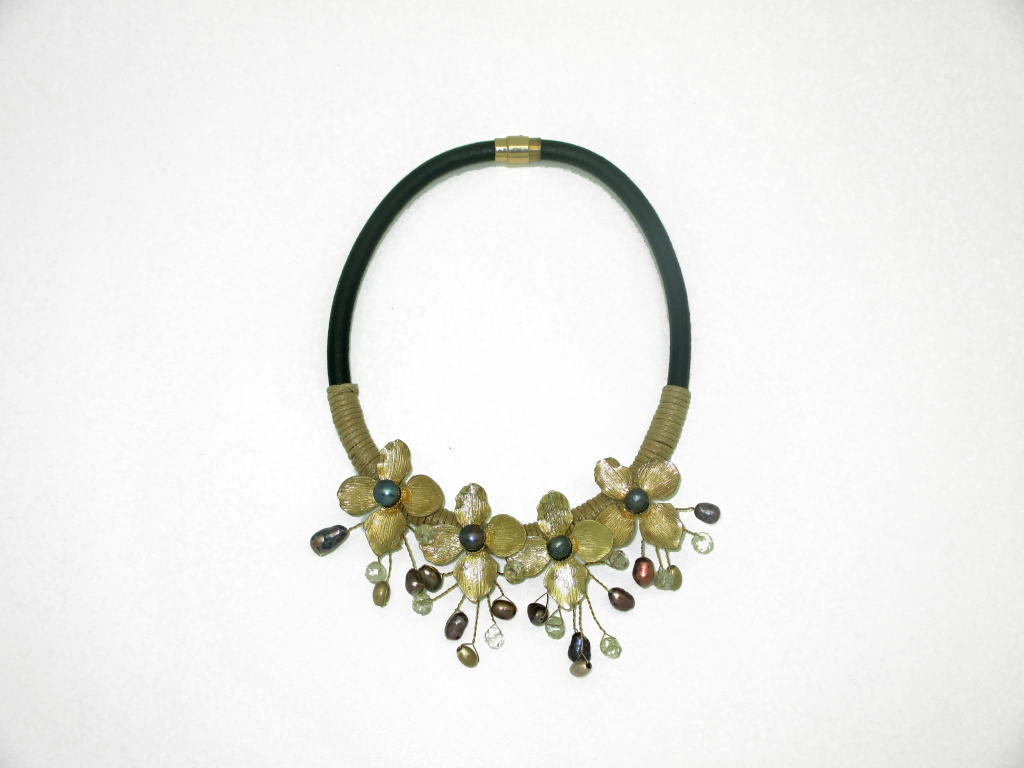 Náhrdelník s kovovými květinami a říčními perlami