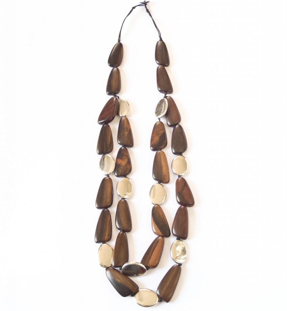 Náhrdelník z dřevěných komponentů a bižuterního kovu.