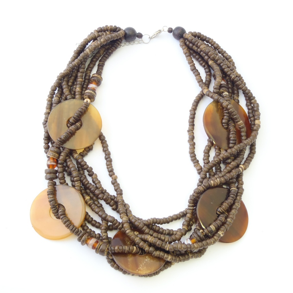 Náhrdelník z dřevěných korálků a pryskyřicových koleček.